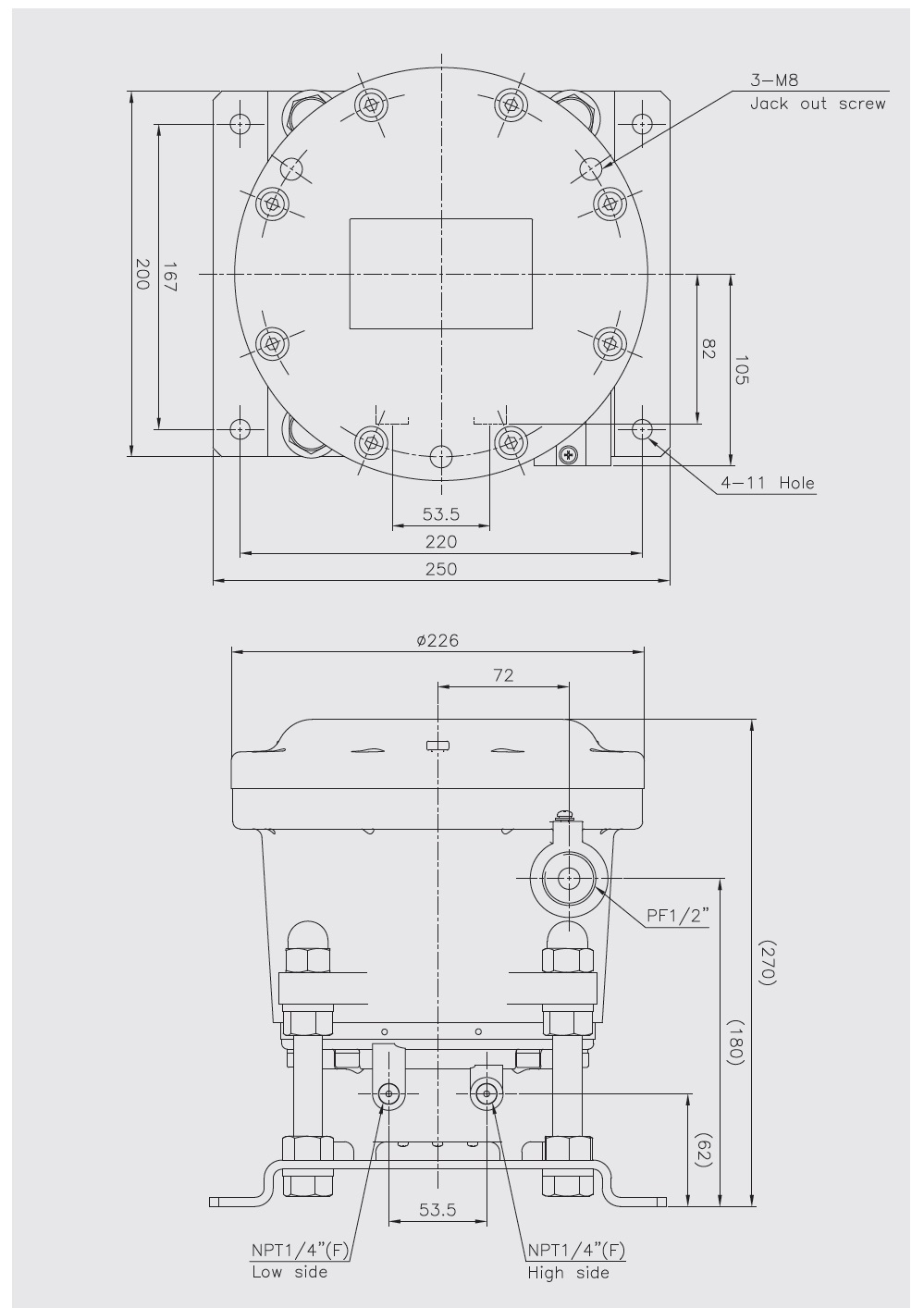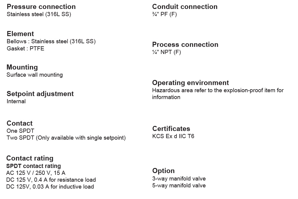 제품 개요 P991 방폭형 차동 스위치 시리즈는 벨로우즈 타입으로, 주로 화력발전소의 통풍압을 감지하는 데 사용됩니다. 제품 제작사양 Fluid Air and gas Repeatability ±1.5 % of full range Dead band Fixed. 0.25 ~ 0.8 kPa or less Differential pressure range (kPa) 0 ~ 4 kPa to 0 ~ 20 kPa Max. Working pressure (Static pressure) 500 kPa Working temperature Ambient : -20 ~ 65 °C Fluid : Max. 60 °C Degress of protection EN60529/IEC529/min IP65 제품 사양