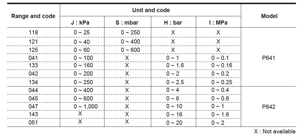 ±1.5 % of full scale Scale range (MPa, kPa, bar, mbar) 0 ~ 25 kPa to 0 ~ 0.25 MPa (P641 model)