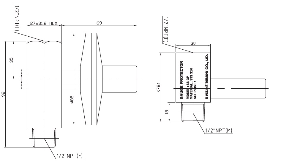 사 양 ▶ Pressure Connection ·3/8” PF & 1/2“ NPT male inlet, female outlet ·1/2“ NPT to 1/4“ NPT adaptors available ▶ Body ·316Ti stainless steel ▶ Piston Valve ·316Ti stainless steel ▶ O-Ring ·FPM (Viton) ▶ Operating Temperature (Media) ·80 °C maximum