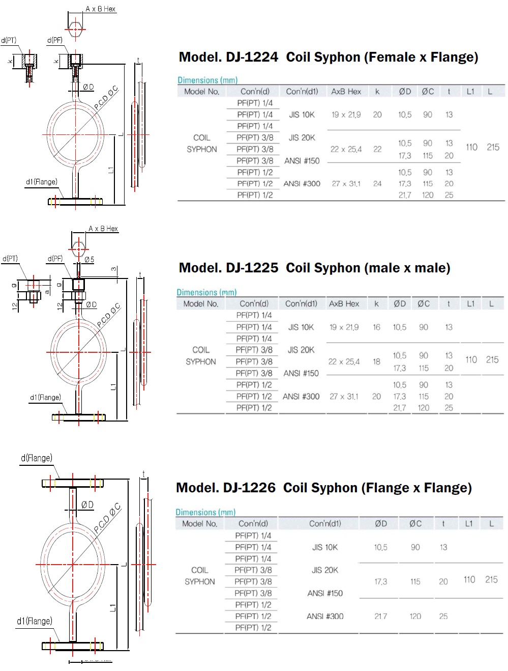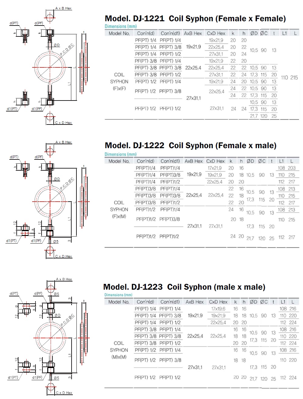 Type Cooling Effect Female x Female Coil Pipe Syphon의 냉각효과는 Pipe의 Female x Male 직경, 길이, 두께, 온도 등에 따라 좌우 됩니다. Male x Male Female x Flange Male x Flange Flange x Flange