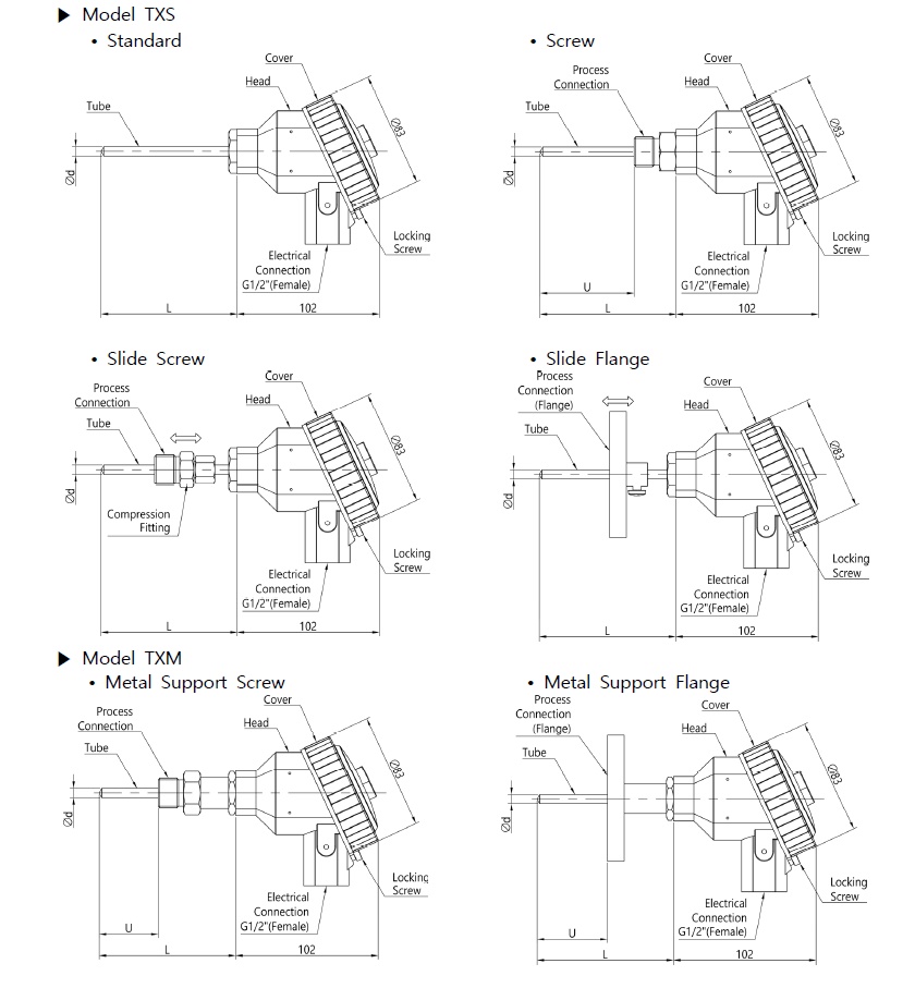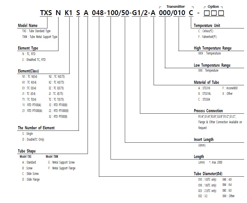 제품 특징 - 내압방폭형 Ex d IIC T6, IP65 - TXS 모델 : 튜브 스텐다드형 - TXM모델 : 튜브 메탈서포트형 - 4~20mA 2선 출력형 - 측정부재질 : 스테인레스스틸 304, 316, 316L, 인코넬600 제품 사용 범위 - 화학용과 석유화학용 - 제어 및 관측용