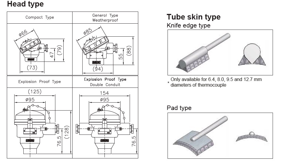 ![]() 온도 센서 R600 제품 개요 온도 센서 R600이 튜브 표면 온도 센서는 보일러, 용광로, 열교환기,반응기에 사용되는 파이프 또는 튜브의 표면 온도를 측정하도록 설계되었습니다. 나이프 엣지 패드 또는 플레이트 용접 패드를 사용하여 센서를 측정 영역에 단단히 부착함으로써 고온 및 부식성 물질에 대한 내 구성을 갖도록 설계되었습니다. 또한, 패드와 시스를 열 팽창으로부터 보호하기 위해 코일 형태로 설계되었습니다. Element Thermocouple : K, E, J, T, N R.T.D. : Pt 100Ω at 0 ℃ Tolerances on temperature reading Class A : ± (0.15 + 0.002 l t l) Class B : ± (0.3 + 0.005 l t l) Sheath outer diameter Thermocouple 1.0, 1.6, 2.3, 3.2, 4.8, 6.4, 8.0, 9.5 and 12.7 mm Double element is not available for 1.0 mm sheath outer diameter R.T.D. 3.2, 4.8, 6.4 and 8.0 mm Head material ALDC (Standard) 304SS (Not available compact type) 316SS (Not available compact type) ![]() R600 : Type of mounting