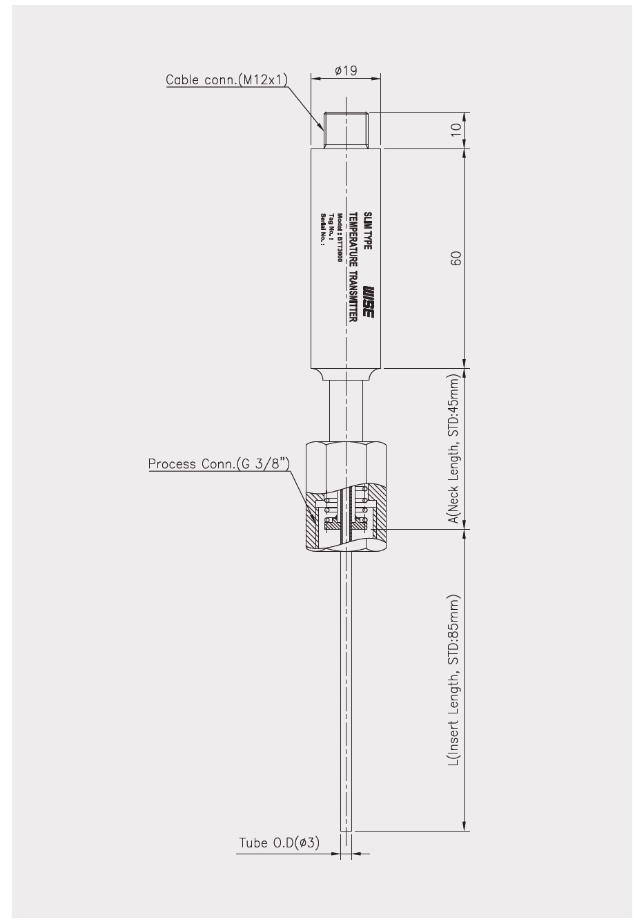 Slim design Standard features Process connection G 3/8"(F) (With well type) Material 316L SS Working temperature Ambient temperature : - 40 to 85 ºC