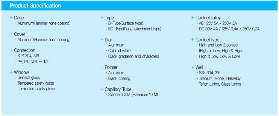 사용용도 배관온도의 지시 및 경보,조절 Plant의 온도지시 및 경보,조절 화학공장 Plant의 온도지시 및 경보,조절 압력용기의 온도지시 및 경보,조절 등등 제작사양 ◈ 정밀등급(Accuracy) • ±2.0% of Full Scale ◈ 제작온도범위(Scale Range) • -30 ~ 600℃ ◈ 과온범위(Over-Temperature) • Range의 배 1.3 ◈ 상용온도(Common Temperature) • 정온도:75% of Full Scale • 변동온도 : 60% of Full Scale